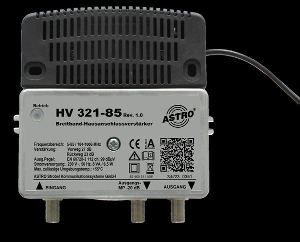 Breitbandverstärker mit 85 MHz Rückweg, Vorweg bis 1006 MHz, Verstärkung Vorweg 27 dB, Ausgangspegel Vorweg 101 dBuV, Verstärkung Rückweg 23 dB, Ausgangspegel Rückweg 109 dBuV, diverse Einstellmöglichkeiten mittels Pads und Steckbrücken zur Konfiguration des Vor- und Rückweges