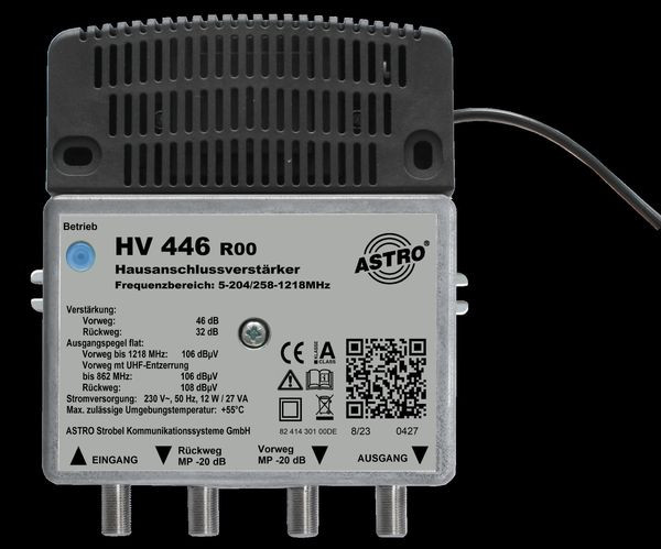 Breitbandverstärker mit 204 MHz Rückweg, Vorweg bis 1218 MHz, Verstärkung Vorweg 46 dB, Ausgangspegel Vorweg 106 dBuV, Verstärkung Rückweg 32 dB, Ausgangspegel Rückweg 108 dBuV, diverse Einstellmöglichkeiten mittels Pads und Steckbrücken zur Konfiguration des Vor- und Rückweges