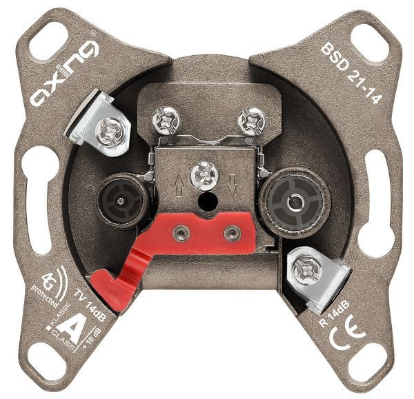 Hyperbreitband-Durchgangsdose 14 dB, 5 - 2200 MHz, CATV Klasse A (+10 dB) gemäß EN 50083-2 Breitbandig rückkanaltauglich Montagefreundlich Absetzmaß 8/13 mm Oberflächenveredelt