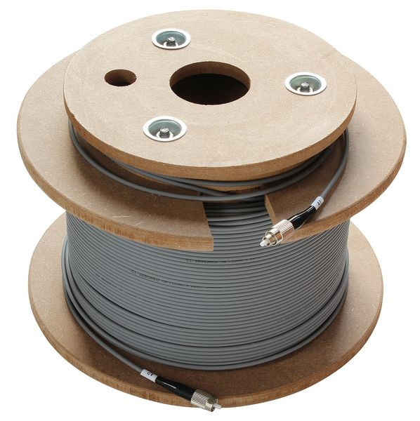Optisches Kabel mit Stahlarmierung, 200 m, 200 m auf Holztrommel, Farbe grau, konfektioniert mit FC/PC-Steckern