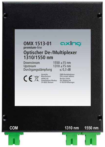 Optischer De-/Multiplexer 1310/1550 nm, Multiplext Signale mit 1310 nm und 1550 nm auf eine Glasfaser, Demultiplext Signale mit 1310 nm und 1550 nm von einer Glasfaser auf zwei Ausgänge, Geringe Einfügedämpfung, Hohe Entkopplung