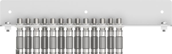 Erdungswinkel, 13-fach, Erdung und Potentialausgleich gemäß EN 60728-11, Bestückt mit premium-line F-Doppelbuchsen CFA 26-02 und Quickfix-Adaptern CFA 4-01N, Für AXING Multischalter SPU 1324-09S und SPU 1724-09S an den Teilnehmerausgängen
