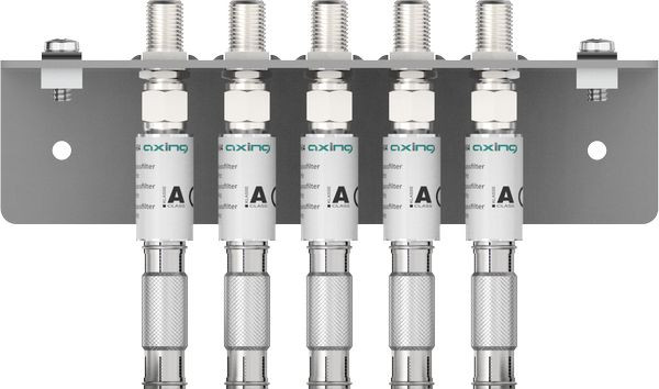 Erdungswinkel, Überspannungsschutz, 5-fach Erdung und Potentialausgleich gemäß EN 60728-11 am Eingang Für AXING Multischalter der Serie SPU 5xx-09N mit 5 Eingängen und Kopfverstärker SVS 550-09N Inkl. Überspannungsschutzgeräte SZU 6-02 Bestückt mit premium-line F-Doppelbuchsen CFA 26-02 und Quickfix-Adapter CFA 4-01N