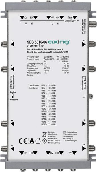Einkabel-Multischalter II, 5 in 8 x 16, premium-line 1 SAT-Position mit Quattro-LNB 2 SAT-Positionen mit Wideband-LNBs Mit terrestrischer Einspeisung Breitbandig rückkanaltauglich (EoC geeignet bis 204 MHz) Kaskadierbar 8 Ausgänge mit je 16 User-Bändern Einkabel I und II kompatibel (entspricht EN 50607 und EN 50494) Störungssicher, keine wohnungsübergreifende Beeinflussung beim Einsatz von programmierbaren SSD 6-xx Antennensteckdosen Alternativ bis zu 8 Legacy-Ausgänge (nicht bei Wideband-LNBs oder SSD 6-xx) Versorgung über ext. Netzteil SZU 99-09S (nicht im Lieferumfang enthalten)