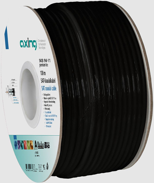 Für SAT-/CATV-Hausinstallation, Klasse A+ gemäß EN 50117-2-4, Brandklasse Eca gemäß EN 50575, Innenleiter Cu, Durchmesser 1,02 mm, Physikalisch geschäumtes Dielektrikum, Durchmesser 4,6 mm, Schirmung Alufolie, geklebt/verzinntes Cu-Geflecht/Alufolie, Mantel PE LSZH, schwarz, UV-beständig nach UL1581, Degressive Metereinteilung, 100 m auf Pappkartonspule.