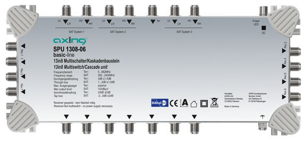 Multischalter Stand-Alone/Kaskadenbaustein, 13 in 8, basic-line Für bis zu 8 Teilnehmer Teilnehmeranschlüsse SAT aktiv, terrestrisch passiv Breitbandig rückkanaltauglich (EoC geeignet bis 204 MHz) Stromversorgung über ext. Netzteil SZU 99-06 (nicht im Lieferumfang enthalten) oder über die SAT-ZF-Stammleitungen Kaskadierbar, Kaskadeausgänge müssen mit DC-entkoppelten 75 Ohm Abschlusswiderständen abgeschlossen werden (z. B. CFA 11-00, nicht im Lieferumfang enthalten).