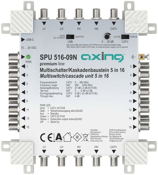 Multischalter Stand-Alone/Kaskadenbaustein, 5 in 16, premium-line Für bis zu 16 Teilnehmer SAT aktiv und Quad-LNB-tauglich CATV-Zweig aktiv schaltbar und einstellbar Breitbandig rückkanaltauglich bei passivem CATV-Zweig (geeignet für EoC bis 204 MHz) Bei passivem CATV-Zweig und Quattro-LNB Receiver-gespeist ? kein Netzteil nötig Bei aktivem CATV-Zweig oder Quad-LNB Stromversorgung über ext. Netzteil SZU 99-09N (nicht im Lieferumfang enthalten) oder über die SAT-ZF-Stammleitungen Zeitgemäße Standby- und Energiesparfunktionalitäten USB-C-Anschluss für externes Netzteil Kaskadierbar (nicht verwendete Kaskadeausgänge müssen mit DC-entkoppelten 75 Ohm Abschlusswiderständen abgeschlossen werden (z. B. CFA 11-00, nicht im Lieferumfang enthalten))