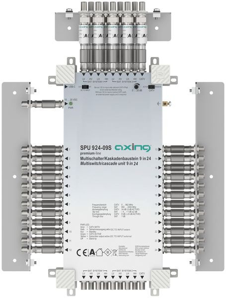 Multischalter Stand-Alone/Kaskadenbaustein, 9 in 24, premium-line Für bis zu 24 Teilnehmer SAT aktiv, CATV-Zweig aktiv schaltbar und einstellbar Breitbandig rückkanaltauglich bei passivem CATV-Zweig (geeignet für EoC bis 204 MHz) Bei passivem CATV-Zweig Receiver-gespeist ? kein Netzteil nötig Bei aktivem CATV-Zweig Stromversorgung über ext. Netzteil SZU 99-09S (nicht im Lieferumfang enthalten) oder über die SAT-ZF-Stammleitungen Zeitgemäße Standby- und Energiesparfunktionalitäten (z. B. nur der benötigte LNB wird versorgt) USB-C-Anschluss für externes Netzteil Kaskadierbar (nicht verwendete Kaskadeausgänge müssen mit DC-entkoppelten 75 Ohm Abschlusswiderständen abgeschlossen werden (z. B. CFA 11-00, nicht im Lieferumfang enthalten))