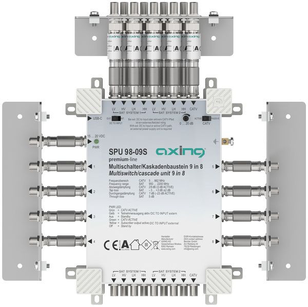 Multischalter Stand-Alone/Kaskadenbaustein, 9 in 8, premium-line, Für bis zu 8 Teilnehmer, SAT aktiv, CATV-Zweig aktiv schaltbar und einstellbar, Breitbandig rückkanaltauglich bei passivem CATV-Zweig (geeignet für EoC bis 204 MHz), Bei passivem CATV-Zweig Receiver-gespeist ? kein Netzteil nötig, Bei aktivem CATV-Zweig Stromversorgung über ext. Netzteil SZU 99-09S (nicht im Lieferumfang enthalten) oder über die SAT-ZF-Stammleitungen, Zeitgemäße Standby- und Energiesparfunktionalitäten (z. B. nur der benötigte LNB wird versorgt), USB-C-Anschluss für externes Netzteil, Kaskadierbar (nicht verwendete Kaskadeausgänge müssen mit DC-entkoppelten 75 Ohm Abschlusswiderständen abgeschlossen werden (z. B. CFA 11-00, nicht im Lieferumfang enthalten))