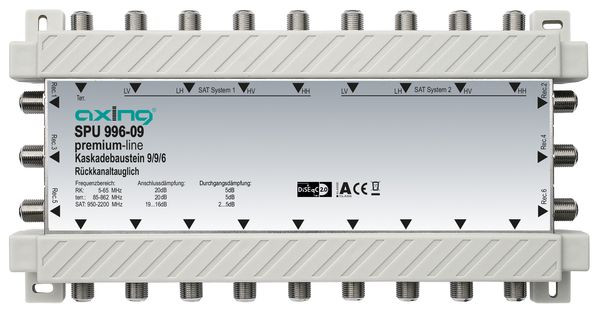 SAT 950-2.200 MHz, Rückkanaltauglich, für digitale Übertragung geeignet Kaskadenbaustein, 9 in 6, premium-line Für bis zu 6 Teilnehmer SAT und terrestrisch passiv Für kaskadierbare 9 in x SAT-Systeme Optimal auf die Multischalter SPU 9xx-09 abgestimmt Breitbandig rückkanaltauglich (EoC geeignet bis 204 MHz)