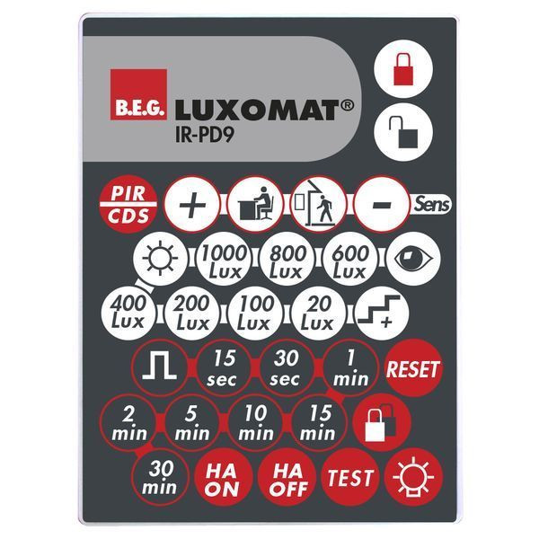 Infrarot-Fernbedienung zum komfortablen Einstellen oder Ändern der Parameter, Inklusive Wandhalterung, Einfache Programmierung der Präsenzmelder PD9-M-1C-SDB-IP65, Die Verwendbarkeit/Kompatibilität des Zubehörs bitte aus den Beschreibungen der Hauptartikel entnehmen