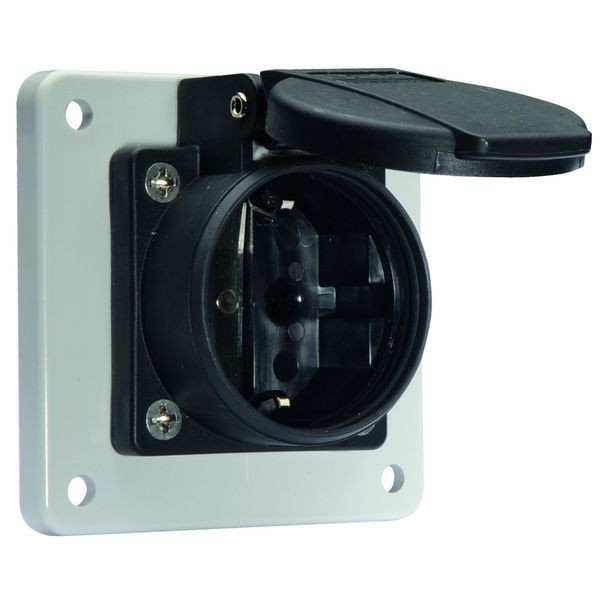 Schutzkontakt-Anbausteckdose 16A 3p (2P+PE) 250V (250V~) IP54 Frequenz: AC Technische Kennfarbe: schwarz RAL 9005 Kontaktträger/Kontakte: Der Kontaktträger ist aus Polyamid, Die Kontakte sind Messing vernickelt Maximaler Leiterquerschnitt: 4,0 qmm Gehäusematerial: Kunststoff Anschlusstechnik: Kopfschraubenklemme Kabeleinführung: sonstige Gerätefarbe: Klappdeckel schwarz RAL 9005, Gehäuse schwarz RAL 9005 Gerätehöhe: 75 mm, Gerätebreite: 75 mm, Gerätetiefe: 47,5 mm Flanschmaß vertikal: 75 mm, Flanschmaß horizontal: 75 mm Bohrlochabstand vertikal: 60 mm, Bohrlochabstand horizontal: 60 mm Halogenfrei: TRUE Sonstige technische Eigenschaften: Zur Verwendung in ortsveränderlichen Verteilersystemen, Der Anschluss ist rückwärtig, mit deutschem System