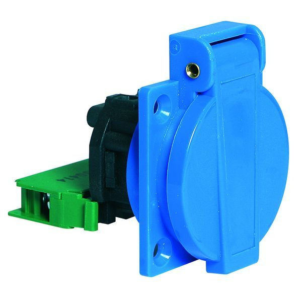 Schutzkontakt-Anbausteckdose 16A 3p (2P+PE) 250V (250V~) IP54 Frequenz: AC Technische Kennfarbe: blau RAL 5015 Kontaktträger/Kontakte: Der Kontaktträger ist aus hochwärmebeständigem Material, Die Kontakte sind Messing vernickelt Maximaler Leiterquerschnitt: 4,0 qmm Gehäusematerial: Kunststoff Anschlusstechnik: Kopfschraubenklemme Kabeleinführung: sonstige System: Deutsches System - Typ F Gerätefarbe: Klappdeckel blau RAL 5015, Gehäuse blau RAL 5015 Gerätehöhe: 61,5 mm, Gerätebreite: 24,5 mm, Gerätetiefe: 70 mm Flanschmaß vertikal: 50 mm, Flanschmaß horizontal: 50 mm Bohrlochabstand vertikal: 38 mm, Bohrlochabstand horizontal: 38 mm Halogenfrei: TRUE Sonstige technische Eigenschaften: Der Anschluss ist rückwärtig, Die Steckdose ist mit einem Hilfs-Kontakt-Schalter (Öffnerkontakt) ausgerüstet, Der Klappdeckel ist selbstschließend