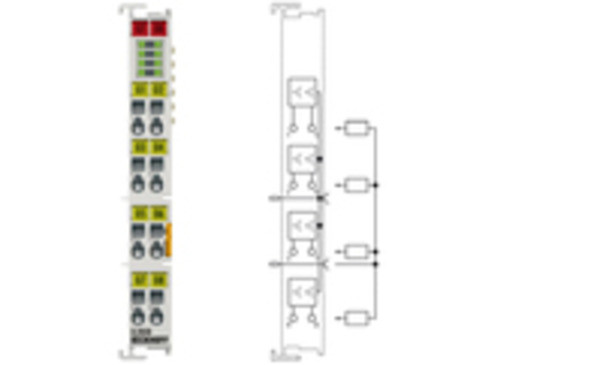 Die digitale Ausgangsklemme EL2008 schaltet die binären Steuersignale des Automatisierungsgerätes galvanisch getrennt zur Prozessebene an die Aktoren weiter. Der Signalzustand der EtherCAT-Klemme wird jeweils durch eine Leuchtdiode angezeigt.