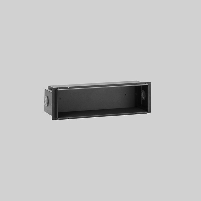 BEGA Einbaugehäuse 10437 für die Montage von Wandeinbauleuchten in Wände aus Beton oder verputztem Mauerwerk. Gehäuse besteht aus Aluminium. 2 gegenüberliegende Leitungseinführungen für Installationsrohre max. ø 30 mm. Abmessungen: 415 x 115 x 125 mm.