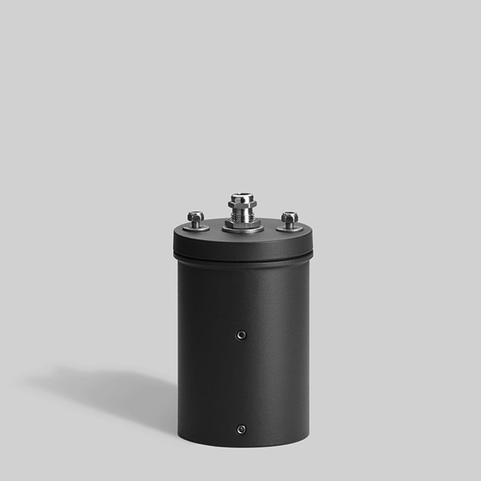 BEGA Aufsatzmuffe 70343 für die Montage eines Scheinwerfers auf einem Lichtmast. Aluminiumguss und Edelstahl, Farbe Grafit. Scheinwerferbefestigung auf einem drehbaren Klemmteller mit zwei M8-Schrauben, Abstand 80 mm und G½ Gewindestutzen mit U-Scheibe und Mutter. 1 Leitungsverschraubung für Scheinwerferanschlussleitung von ø 8-11 mm. Mastzopfdurchmesser 89 mm, Einstecktiefe 150 mm. Höhe: 175 mm.