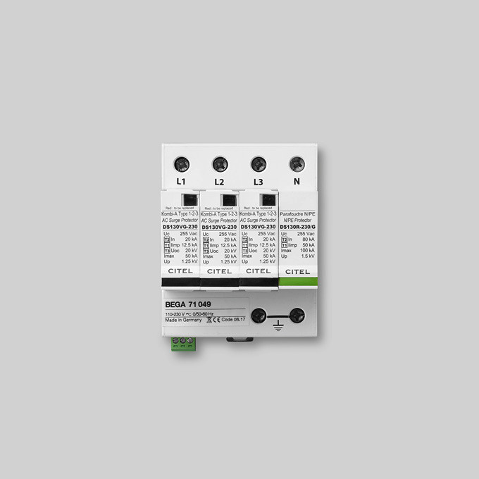 BEGA CITEL Überspannungsschutz 71049 gemäß EN 61643-11 für Hutschienenmontage. Für den Schutz von 3-phasig versorgten Leuchtengruppen. Nennableitstrom 80 kA. Schutzpegel: < 1,5 kV (L/PE), < 1,25 kV (L/N).