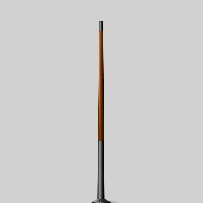 BEGA Lichtmast 71194 mit Leimholz nach DIN EN 14080 und Aluminium. Konisch, unterer Durchmesser 135 mm, mit Fußplatte Ø 340 mm. Höhe über Flur 5000 mm. Mastzopfdurchmesser 76 mm. Tür mit Vierkant-Verschluss aus Edelstahl und Gerätesteg mit Schutzleiteranschluss und zwei Schiebemuttern M6 zur Aufnahme eines Anschlusskastens. Mit Fußplatte zum Aufschrauben auf ein Fundament oder auf das Erdstück 70899.