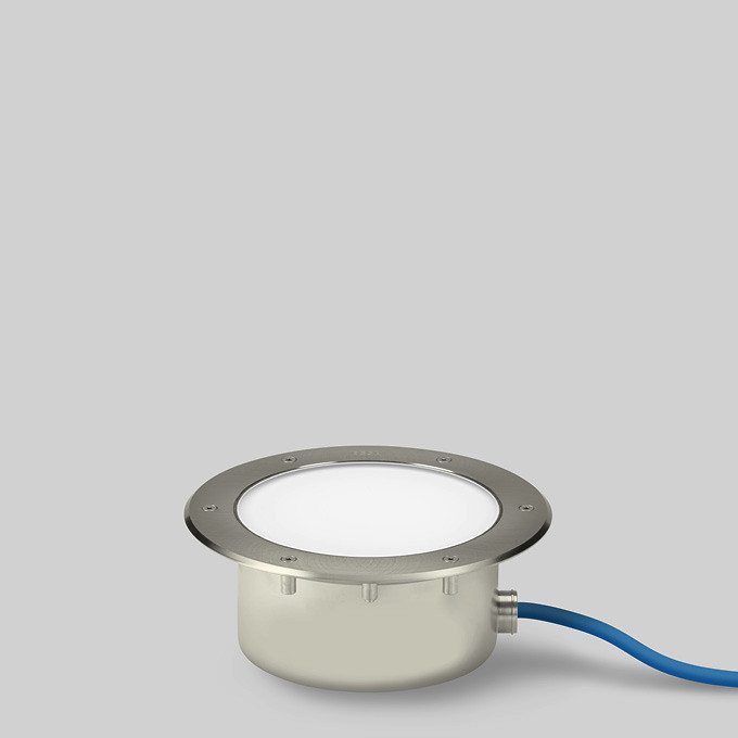 BEGA Bodeneinbauleuchte 77057RK3, überrollbar für Druckbelastung bis 2.000 kg (~20 kN). Orientierungsleuchte. Rutschhemmendes Glas nach DIN 51130 R 13, mattiert. LED, 4,8 W Leuchten-Anschlussleistung, Leuchten-Lichtstrom null, Farbtemperatur 3000 K. Farbwiedergabeindex (CRI) > 80. Mit austauschbarem BEGA LED-Modul mit Übertemperaturschutz und einer Lebenserwartung von mindestens 50.000 Betriebsstunden. 20-jährige Nachliefergarantie auf das LED-Modul und die Verschleißteile. Mit BEGA Ultimate Driver® LED-Netzteil 220-240 V, 0/50-60 Hz. Schutzart IP 68 10 m. Leuchte aus Edelstahl, Werkstoff-Nr. 1.4301. Sicherheitsglas weiß. 1,8 m wasserbeständige Anschlussleitung 07RN8-F 3 G 1 qmm mit eingebautem Wasserstopper und 1,2 m PVC-Installationsrohr. Leuchtendurchmesser 245 mm, Einbautiefe 90 mm.