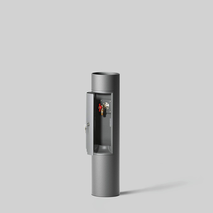 BEGA Pollerleuchtenrohr 84998A mit integriertem Wasseranschluss. Aluminium Beschichtungstechnologie BEGA Unidure® , Farbe Silber. Für die Verwendung im modularen Systempollerleuchten-Programm. Innenliegender Winkel-Kugelhahn aus Messing. 0,7 m Panzerschlauch mit Überwurfmutter 1/2". Mit abschließbarer Tür und BKS Sicherheitsschloss mit zwei Schlüsseln. Mit Montageplatte zum Aufschrauben auf ein Fundament oder auf das Erdstück 70896. Höhe 815 mm. Durchmesser: 190 mm.