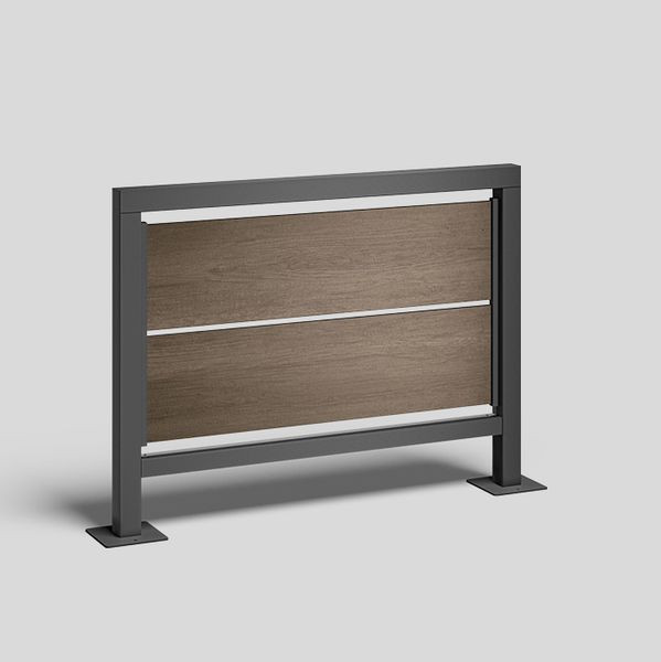 BEGA Sichtschutz-Element 95008MO in besonders robuster Konstruktion für die Montage im halböffentlichen Raum. Das Sichtschutz-Element wird über ein Befestigungssystem bauseits mit dem Fundament verschraubt. Rahmen aus stranggepresstem Aluminiumprofil, pulverbeschichtet und lackiert, Farbe grafit. Sichtschutz besteht aus UV-resistentem und wasserfestem Hochdrucklaminat. Dekor Marshland Oak. 2 Aufschraubsockel aus Stahl feuerverzinkt nach EN ISO 1461 für die Montage auf ein bauseitig erstelltes Fundament oder andere befestigte Flächen, z.B. Terrassen und Wegeplatten. Sockelplatten mit je 2 Befestigungsbohrungen ø 11 mm, Abstand 150 mm. Abmessungen: 1400 x 70 x Höhe 1050 mm.