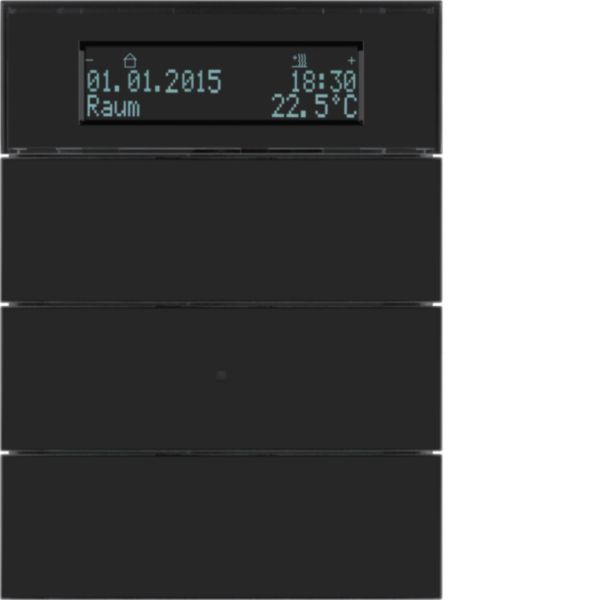 für Busankoppler UP, mit Temperaturregler; zur Installation in einfachen Einbaudosen; rahmenloses Design; mit Demontageschutz; mit blauer Betriebs-LED und weißen Status-LEDs (Beschriftungsfeld-Beleuchtung); LC-Display mit Symboldarstellung, Textanzeige und Beleuchtung; mit 2 zusätzlichen Display-Funktionstasten; Ein- und Zweiflächenbedienung parametrierbar; mit Raumtemperaturschaltuhr- und 2 Wochenschaltuhrfunktionen; für individuelle Einzelraumregelung, für stetige (PI-) oder schaltende (2-Punkt-) Regelung von max. 2 Regelkreisen. Tastsensor 3fach mit Temperaturregler und Display B.IQ Glas, schwarz