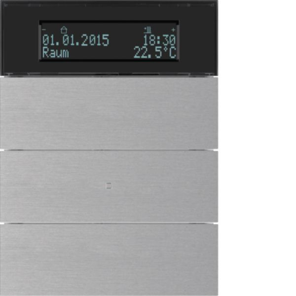 für Busankoppler UP, mit Temperaturregler; zur Installation in einfachen Einbaudosen; rahmenloses Design; mit Demontageschutz; mit blauer Betriebs-LED und weißen Status-LEDs (Beschriftungsfeld-Beleuchtung); LC-Display mit Symboldarstellung, Textanzeige und Beleuchtung; mit 2 zusätzlichen Display-Funktionstasten; Ein- und Zweiflächenbedienung parametrierbar; mit Raumtemperaturschaltuhr- und 2 Wochenschaltuhrfunktionen; für individuelle Einzelraumregelung, für stetige (PI-) oder schaltende (2-Punkt-) Regelung von max. 2 Regelkreisen. Tastsensor 3fach mit Temperaturregler und Display B.IQ Alu