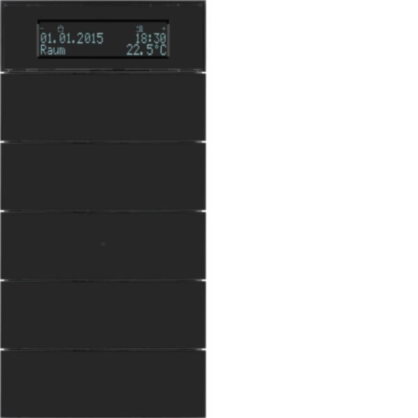 für Busankoppler UP, mit Temperaturregler; zur Installation in einfachen Einbaudosen; rahmenloses Design; mit Demontageschutz; mit blauer Betriebs-LED und weißen Status-LEDs (Beschriftungsfeld-Beleuchtung); LC-Display mit Symboldarstellung, Textanzeige und Beleuchtung; mit 2 zusätzlichen Display-Funktionstasten; Ein- und Zweiflächenbedienung parametrierbar; mit Raumtemperaturschaltuhr- und 2 Wochenschaltuhrfunktionen; für individuelle Einzelraumregelung, für stetige (PI-) oder schaltende (2-Punkt-) Regelung von max. 2 Regelkreisen. Tastsensor 5fach mit Temperaturregler und Display B.IQ Glas, schwarz