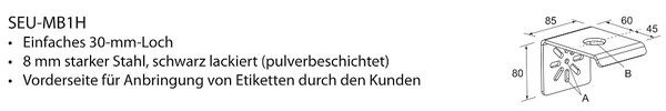 | Kurzbeschreibung | Befestigungswinkel für Not-Halt-Schalter Typ SEU-4 (runde Bauform), 1 x 30 mm Loch, Metall, schwarz |