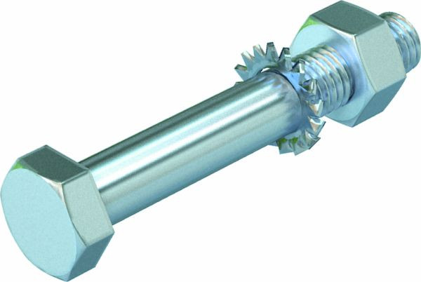 Sechskantschraube zur universellen Befestigung von Konstruktionsbauteilen. Inklusive Sechskantmutter und 2 Unterlegscheiben.