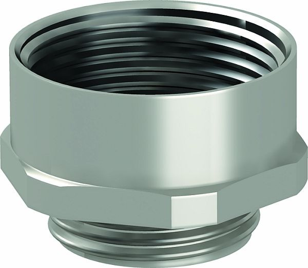 Erweiterung aus Messing mit metrischem Innen- und Außengewinde für die Montage von Kabelverschraubungen aus Metall oder Kunststoff an Gehäusen. Schutzart IP54 ohne zusätzliche Anschlussdichtung. Schutzart bis IP68 möglich mit zusätzlicher Anschlussdichtung, zum Beispiel O-Ring oder Flachdichtring.