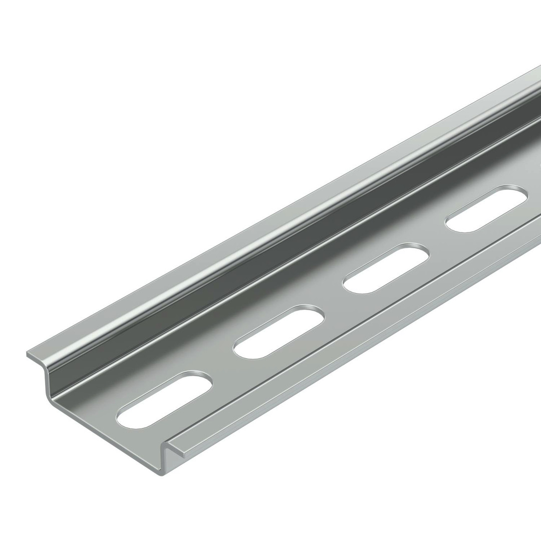 Gelochte Hutschiene 35 x 7,5 mm zur Aufnahme von elektrischen Geräten wie Sicherungsautomaten, Netzgeräten, Leistungsschaltern, Relais, Überspannungsschutzgeräten oder Reihenklemmen. Lochung 6,2 x 18 mm. Gemäß DIN EN 60715 (früher DIN EN 50022).