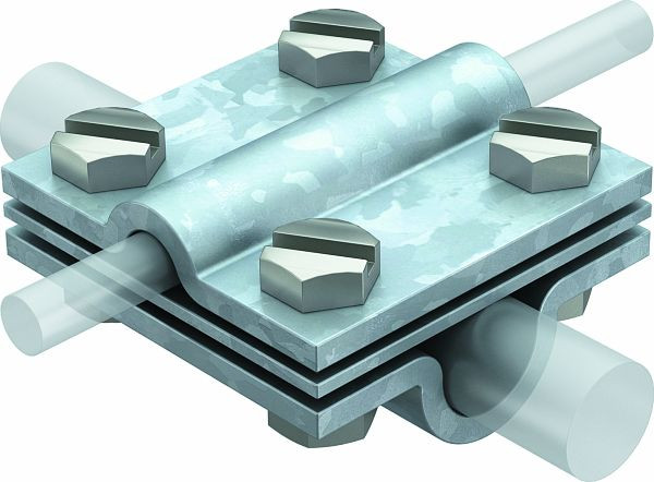 für Rundleiter und Fang-/Erdeinführungsstangen, mit Zwischenplatte, montiert mit 4 Sechskantschrauben M8 x 25 und 4 Sechskantmuttern M8