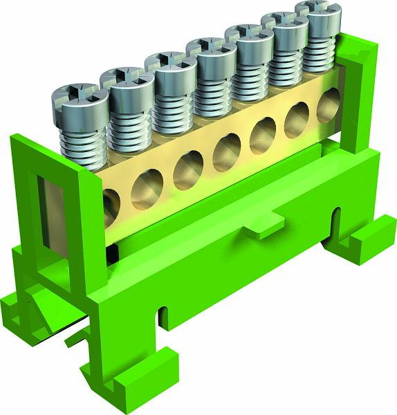 7 Klemmstellen bis 16 mm², Klemmschiene Messing vernickelt, Schrauben Stahl, galvanisch verzinkt und transparent passiviert, zum Aufschnappen auf Hutschienen 35 mm nach DIN EN 50022 (quer) oder Flachschienen 10 x 2-2,5 mm (längs)
