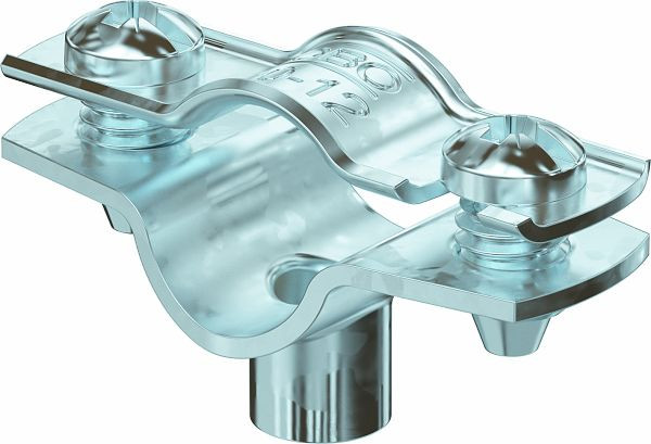 Abstandschelle zur Montage von Rohren und Kabeln an Wand, Decke und Boden. Mit selbstsicherndem Oberteil. Befestigung über Ansatz mit Innengewinde. Oberflächen G und FT ab Schellengröße 20 geeignet für Montage mit Nagelgerät oder Bolzensetzgerät.