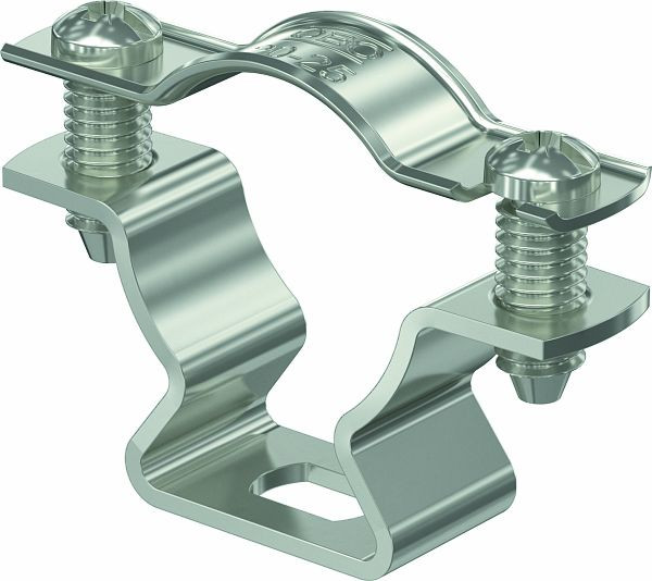 Abstandschelle zur Montage von Rohren und Kabeln an Wand, Decke und Boden. Mit selbstsicherndem Oberteil. Befestigung über Langloch.