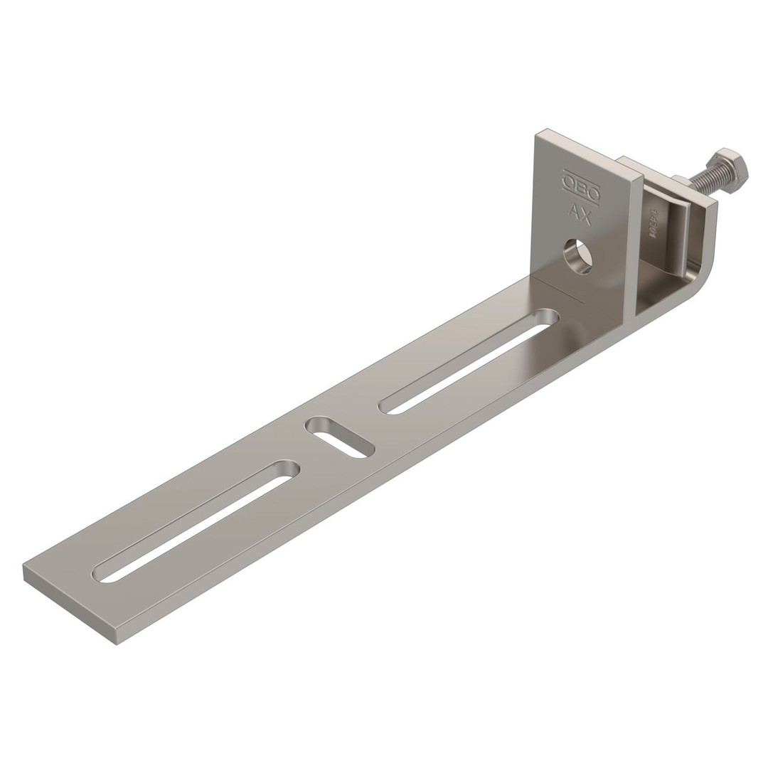 Befestigungsklemmstück zur Montage von leichten Bauteilen an senkrechten Stahlträgern. Geeignet z. B. für Gitterrinnen und Kabelrinnen bis 300 mm Breite oder Schellen. Der Verlauf des am Befestigungsklemmstück angebrachten Kabeltragsystems ist senkrecht.