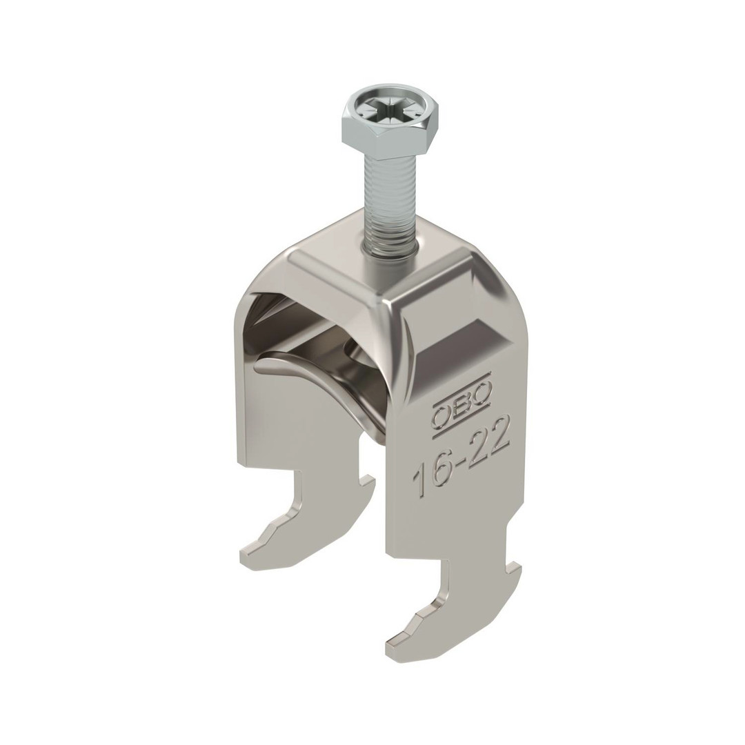 Bügelschelle mit Hammerkopf-Fuß, Metalldruckwanne mit gerundeten Kanten für Kabelschutz. Zur vertikalen und horizontalen Montage von 1 Einzelkabel an C-Profilschiene. Für Schlitzweite 16 - 17 mm. Mit 1-gängiger Schraube an Druckwanne, universeller Sechskant-Schraubenkopf SW10, mit Schlitz und Kreuzschlitz. Geeignet für Montage im Innen-und Außenbereich. Der Einsatz einer Gegenwanne wird empfohlen.