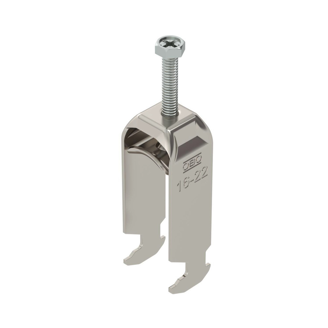 Bügelschelle mit Hammerkopf-Fuß, Metalldruckwanne mit gerundeten Kanten für Kabelschutz. Zur vertikalen und horizontalen Montage von 2 Einzelkabeln an C-Profilschiene. Für Schlitzweite 16 - 17 mm. Mit 1-gängiger Schraube an Druckwanne, universeller Sechskant-Schraubenkopf SW10, mit Schlitz und Kreuzschlitz. Geeignet für Montage im Innen- und Außenbereich. Mehrere Kabel sollten durch Doppelwannen getrennt werden. Der Einsatz einer Gegenwanne wird empfohlen.