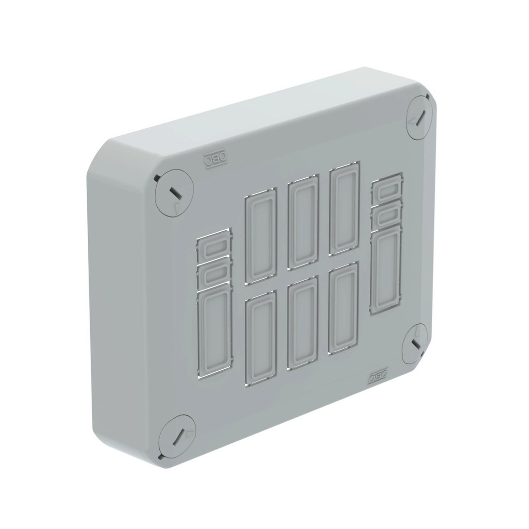 Steckbarer Deckel zum Verschließen von Kabelabzweigkästen, ausgestattet mit 8 Ausbrechöffnungen für Anschlussbuchsen von Wieland und Wago, 3- bis 5-polig. Mit Schnellverschluss im Deckel, plombierbar. Halogenfreies Material, UV-resistent. Flammwidrig nach DIN EN 60695-2-11, Prüftemperatur 650°C. Schlagfestigkeit IK07 bei Raumtemperatur. Schutzart IP30.