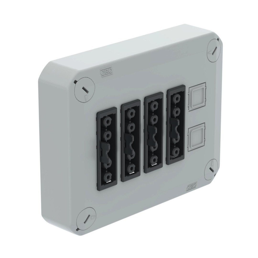 Steckbarer Deckel zum Verschließen von Kabelabzweigkästen, bestückt mit 4 Wieland GST18-Stecksystemen, vorverdrahtet mit Hebelsteckklemmen. Mit Schnellverschluss im Deckel, plombierbar. Halogenfreies Material, UV-resistent. Flammwidrig nach DIN EN 60695-2-11, Prüftemperatur 650°C. Schlagfestigkeit IK07 bei Raumtemperatur. Schutzart IP30.