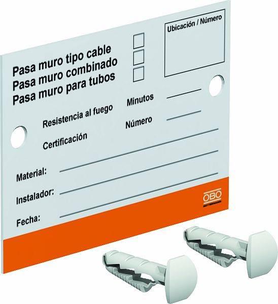 Kennzeichnungsschild zum Selbstbeschriften mit wasserfestem und lichtechtem Filzschreiber für brandsichere Kabeldurchführungen, inklusive 2 Steckdübeln.