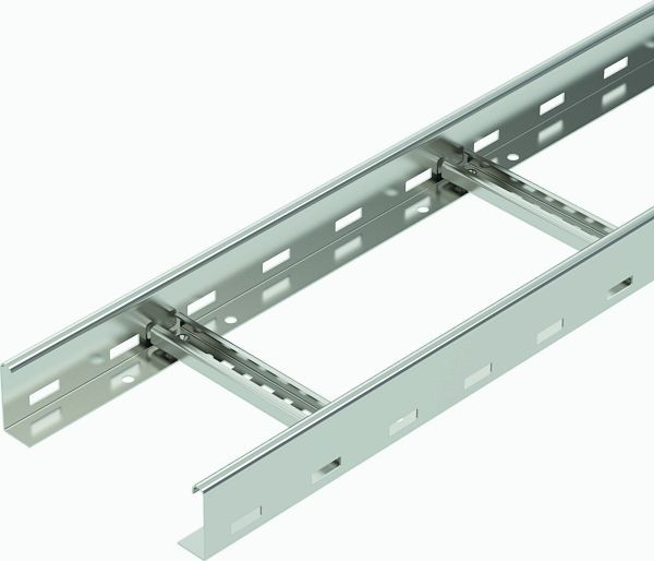 Kabelleiter in Seitenhöhe 60 mm mit eingeschweißten, nach oben offenen C30- Profil Sprossen. Eingerollter Seitenholm zur Verstärkung und als Kantenschutz. Die Befestigung auf dem Ausleger erfolgt mit Klemmstücken Typ LKS 40. Das Schlitzmaß der Sprosse beträgt 16,5 mm, die passende Bügelschelle ist der Typ 2056.