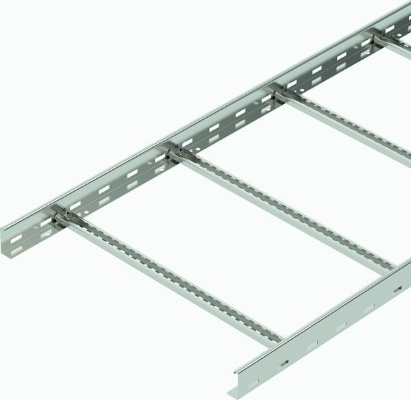 Kabelleiter in Seitenhöhe 60 mm mit eingeschweißten, nach oben offenen C30- Profil Sprossen. Eingerollter Seitenholm zur Verstärkung und als Kantenschutz. Die Befestigung auf dem Ausleger erfolgt mit Klemmstücken Typ LKS 40. Das Schlitzmaß der Sprosse beträgt 16,5 mm, die passende Bügelschelle ist der Typ 2056.