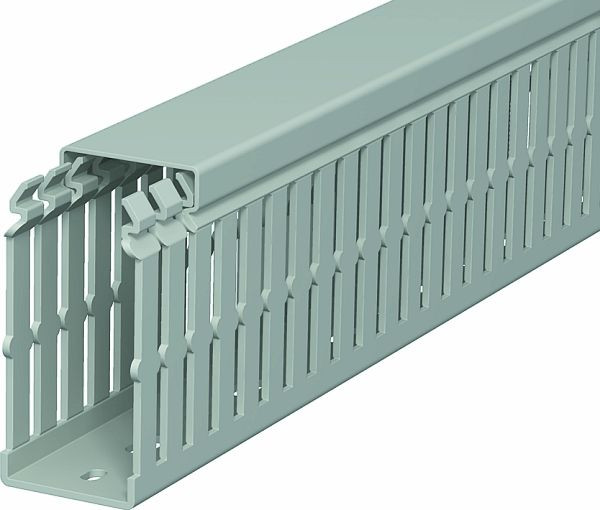 Verdrahtungskanal nach DIN EN 50085-2-3 inkl. Oberteil und Bodenlochung zur waagerechten und senkrechten Verlegung elektrischer Kabel und Leitungen im Schaltschrank. Ausführung als DIN-Kanal. Das Ausbrechen der Stege erfolgt werkzeuglos. Bodenbündiges Ausführen ist durch Sollbruchstellen möglich. Verjüngungen in den Seitenschlitzen verhindern das Herausfallen der Leitungen. Geprüft nach DIN EN 50085-2-3. Sonderlängen auf Anfrage.