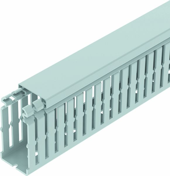 Halogenfreier Verdrahtungskanal nach DIN EN 50085-2-3 inkl. Oberteil und Bodenlochung zur waagerechten und senkrechten Verlegung elektrischer Kabel und Leitungen im Schaltschrank. Ausführung als DIN-Kanal. Das Ausbrechen der Stege erfolgt werkzeuglos. Bodenbündiges Ausführen ist durch Sollbruchstellen möglich. Verjüngungen in den Seitenschlitzen verhindern das Herausfallen der Leitungen. Geprüft nach DIN EN 50085-2-3. Sonderlängen auf Anfrage.