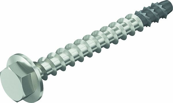 Edelstahl-Schraubanker zur direkten Montage ohne Dübel in gerissenem und ungerissenem Beton sowie Mauerwerk. Mit Sechskantantrieb und angepresster Scheibe zur Aufnahme großer Lasten. Geeignet für die Befestigung von Hängestielen und Wandauslegern in Feuchträumen und im Außenbereich.