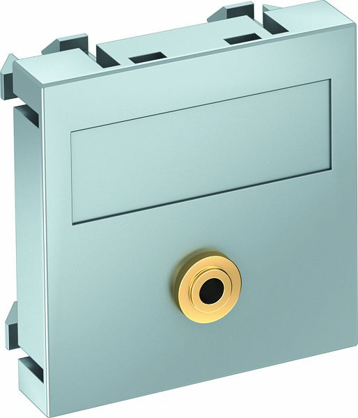 Multimediaträger mit einer Mini-Klinken-Anschlussbuchse, Kabelauslass gerade, mit Beschriftungsfeld, Mini-Klinken-Buchse (TRS 3,5 mm) mit Lötanschluss. Trägerplatte mit Rastbefestigung, geeignet für den waagerechten und senkrechten Einbau in die Systemumgebung.