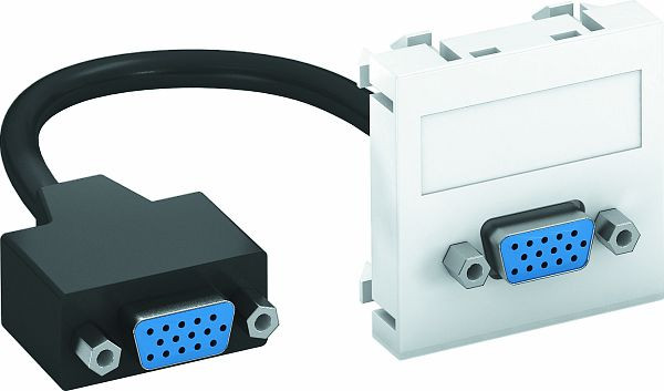 Multimediaträger mit einer VGA-Anschlussbuchse, Kabelauslass gerade, mit Beschriftungsfeld, kurzes VGA-Anschlusskabel (HD15) in Ausführung Buchse-Buchse. Träger mit Rastbefestigung, geeignet für den waagerechten und senkrechten Einbau in die Systemumgebung.