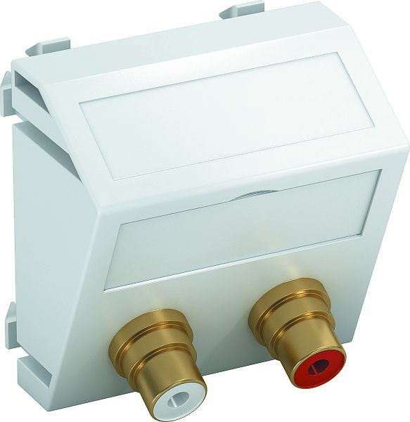 Multimediaträger mit zwei Cinch-Anschlussbuchsen für Audio R/L, Kabelauslass schräg, mit Beschriftungsfeld, zwei Cinch-Kupplungen (RCA) in Ausführung Buchse-Buchse, Farbkodierung rot/weiß. Trägerplatte mit Rastbefestigung, geeignet für den waagerechten und senkrechten Einbau in die Systemumgebung.